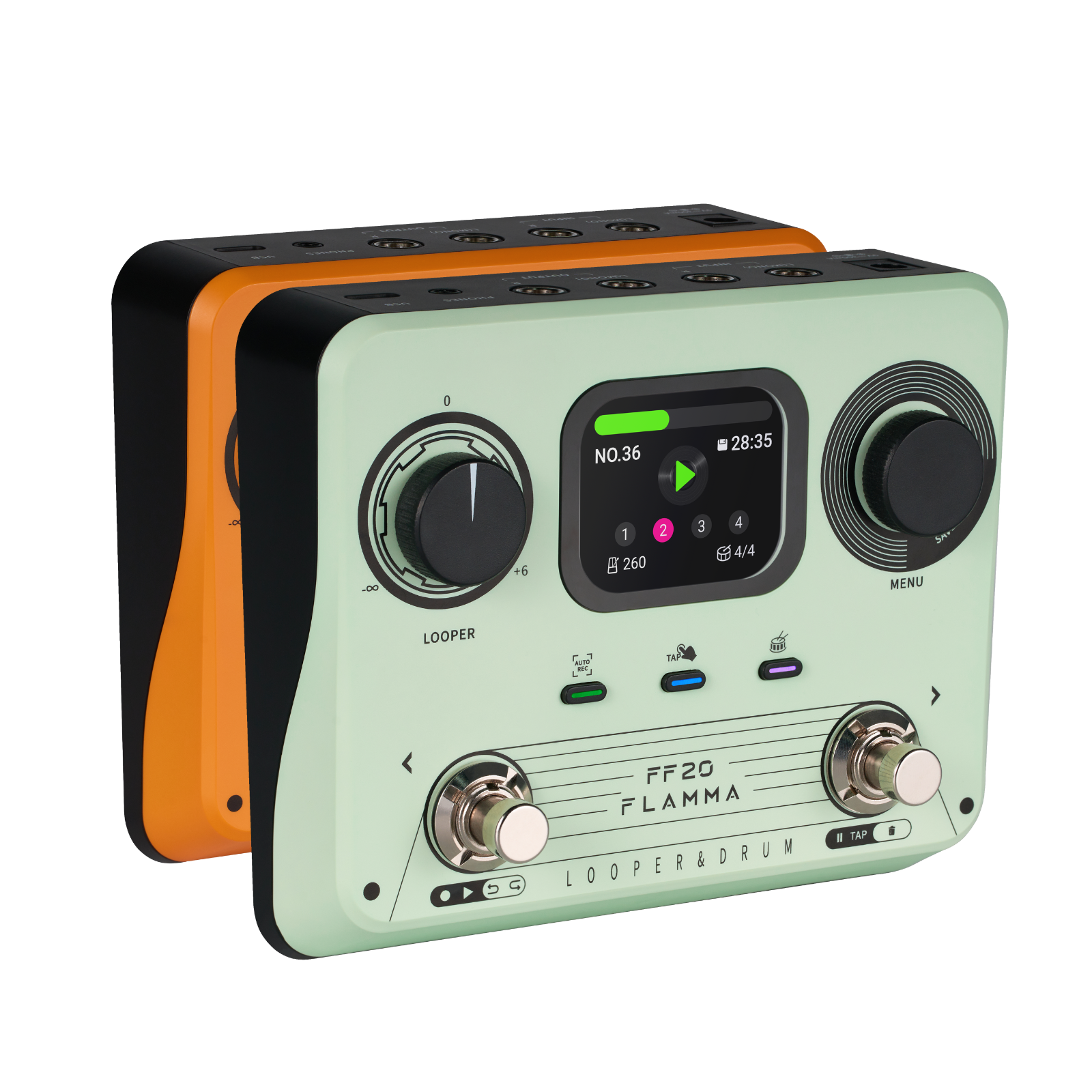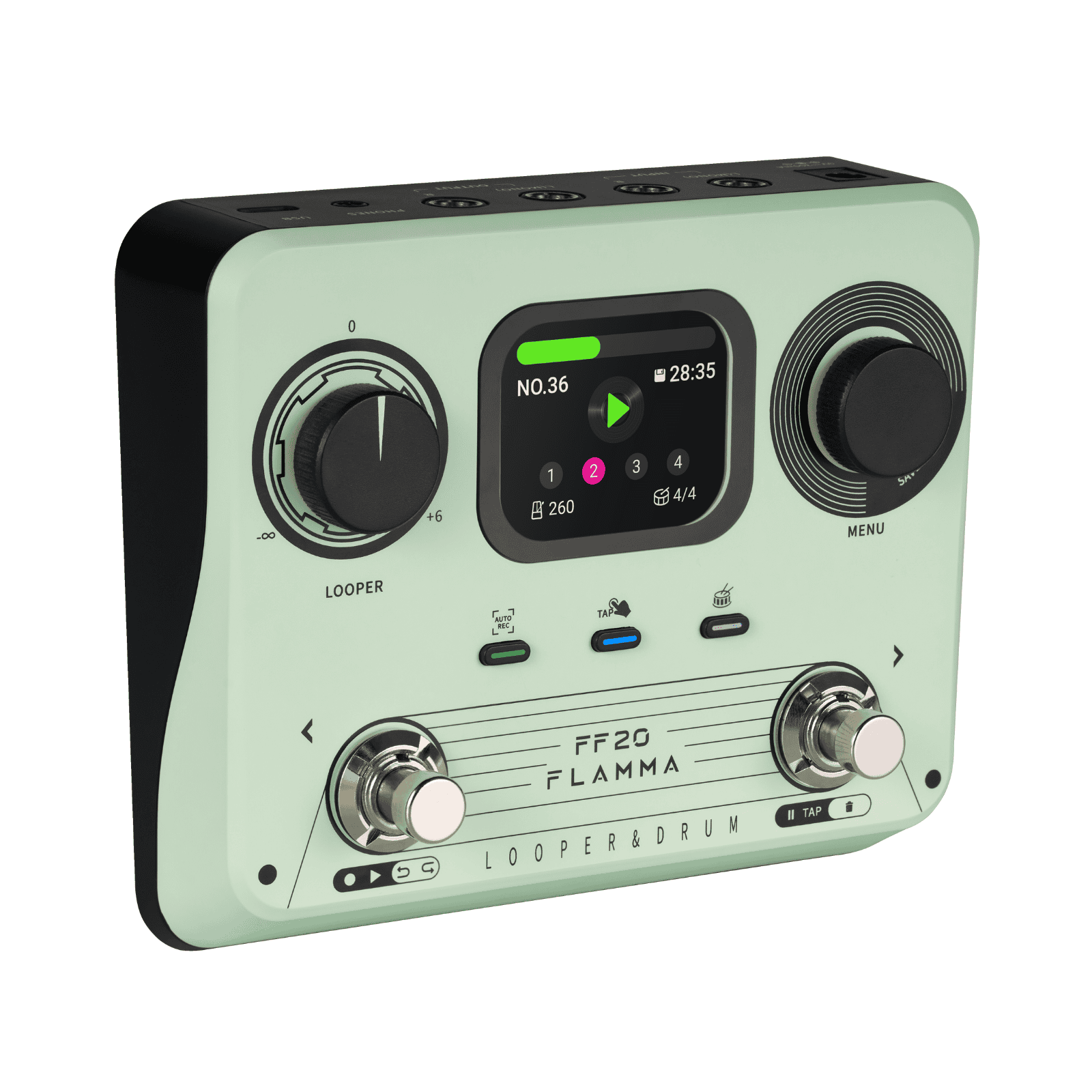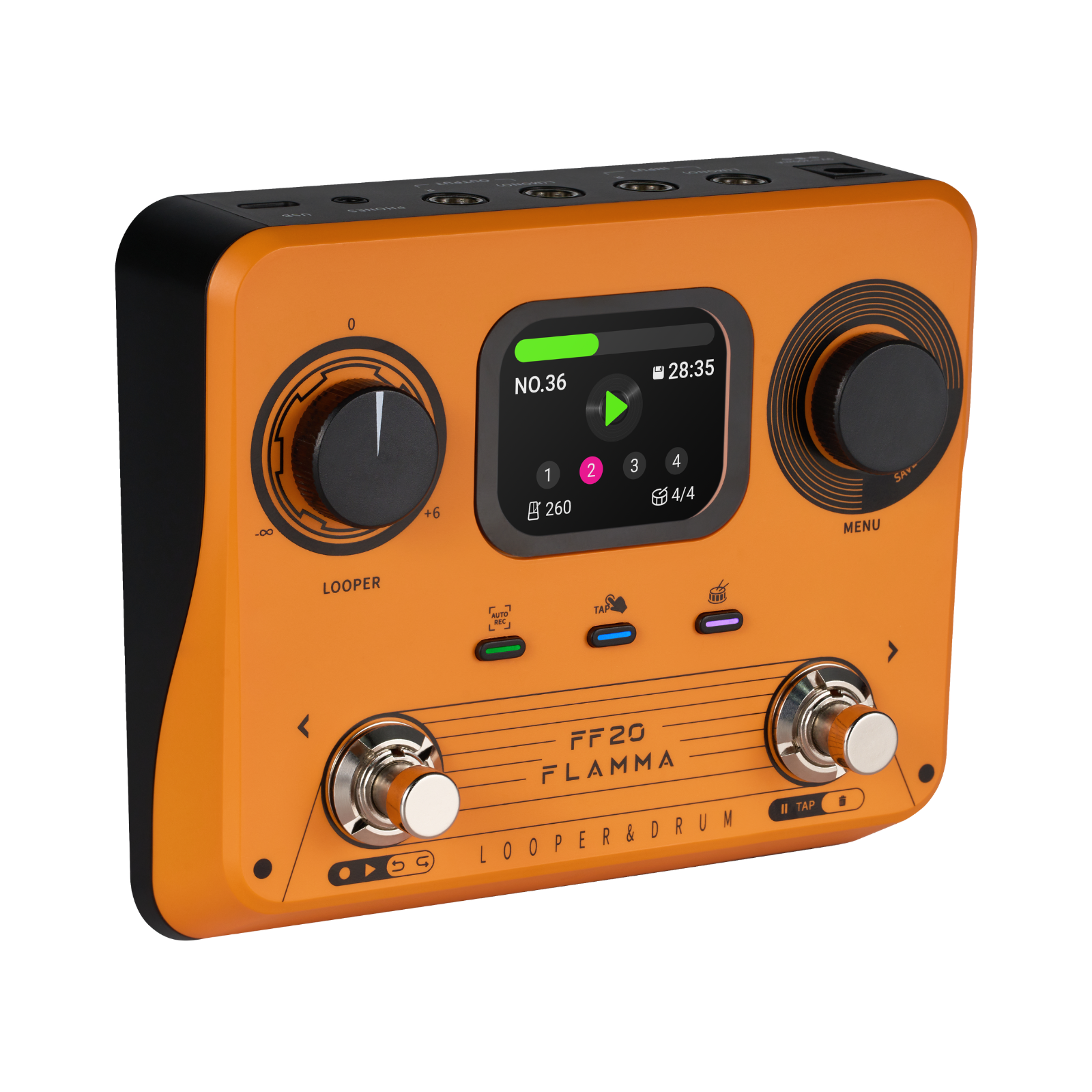 In terms of user interface, the FF02 is kept minimalistic and tidy. A 2-inch screen is found at the center of the device, providing clear function status and parameter details. To the left is a looper volume dial, and to the right is the menu encoder, used for navigating the screen's menu, adjusting parameters, and activating looper functions. Three separate buttons are also provided to activate Auto Record mode, the drum machine, and tap tempo functionality. Finally, the two footswitches are multifunctional, controlling various edit controls of the looper and drum machine while also primarily serving as save slot browsers.